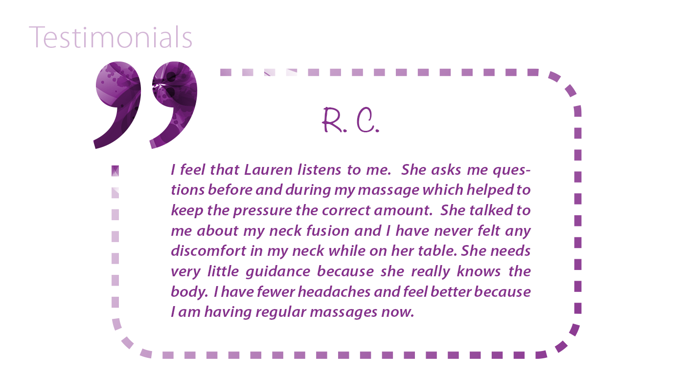 During my time in the massage therapy field I have worked hard to build a loyal client base through my consistency, reliability and quality of treatment. I cannot give my clients the massage they need unless they communicate with me. It is extremely important to listen to my clients.